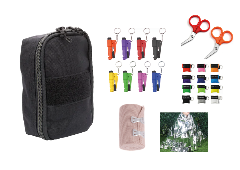 Mun-mot-mun-skydd i litet nyckelringsformat, en sax, ett elastiskt bandage, en värmeisolerande termisk filt, och en kombinerad glaskrossare-bältesskärare-visselpipa i nyckelringsformat.
