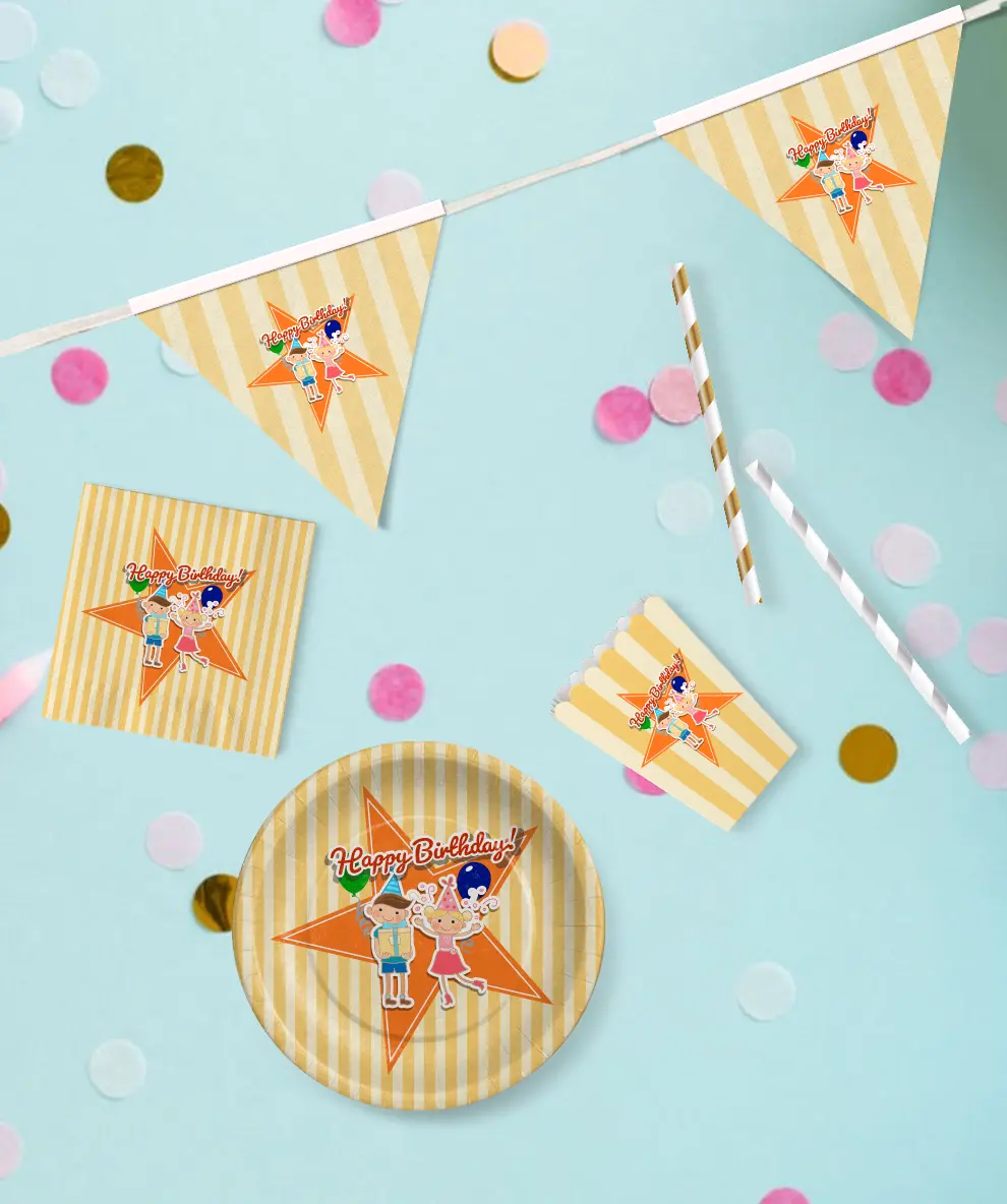 | Size: | Servetten är 33x33 cm (1/4-vikta), popcornbägarna är 6,3x4,5x13 cm, tallrikarna är ca. 18 cm i diameter, flaggvimplarna är 20 cm i höjd och bredd, sugrören är ca. 19 cm långa |