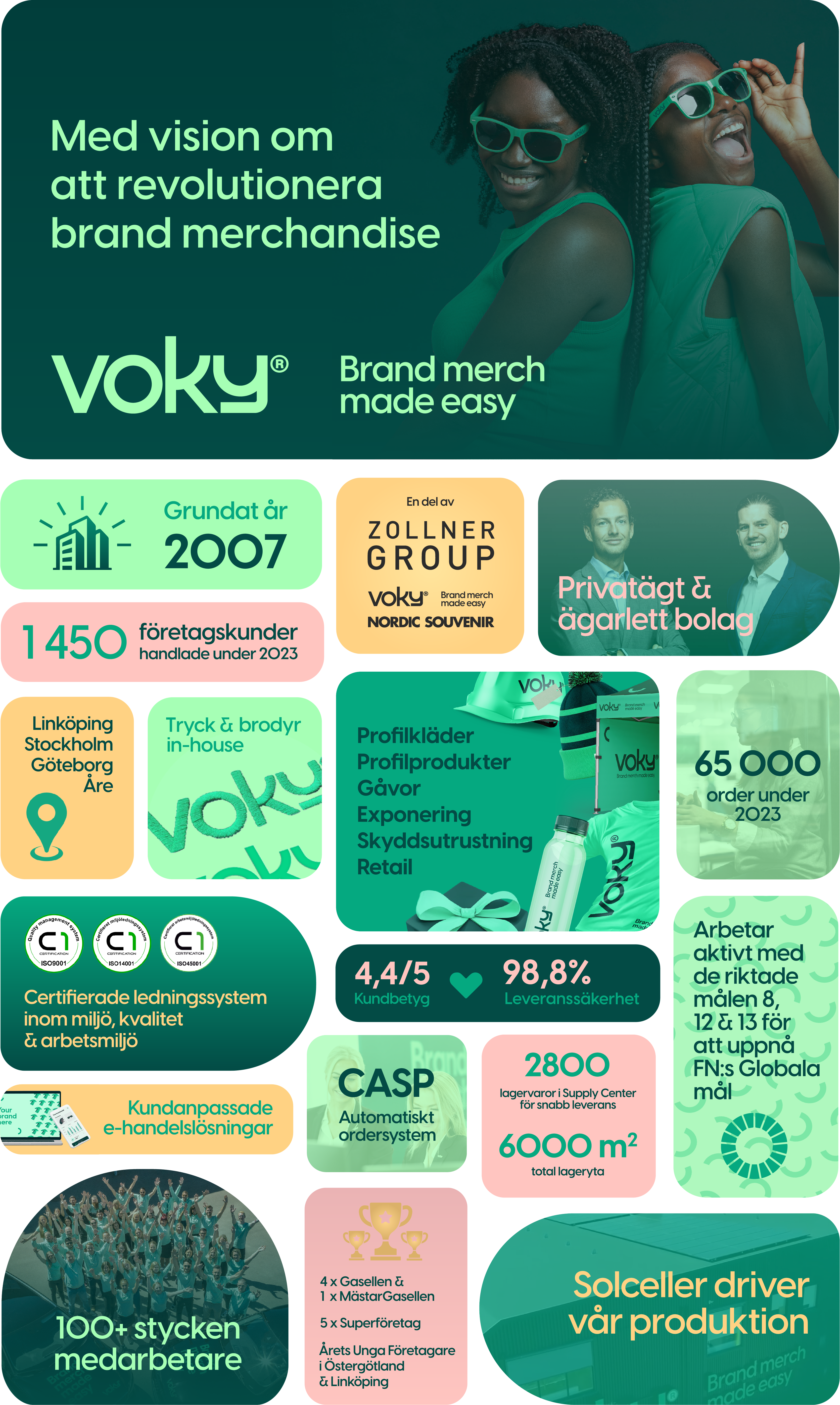 Vi är Voky och vi är här för att revolutionera brand merchandise. Hur? Genom att göra det enklare, och då menar vi mycket enklare, för våra kunder att stärka sina varumärken. Detta gör vi genom smarta digitala lösningar och strategier som genom automatiska flöden och genuint kvalitetsarbete skapar fokus på ständig förbättring.
